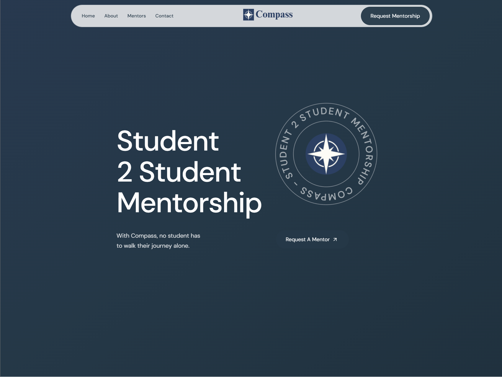 Website for Compass, a student-to-student mentorship program that pairs experienced peer mentors with younger students navigating academic transitions. The site explains the 4-step process (Connect → Match → Meet → Reflect), communicates core values, and funnels students toward requesting a mentor or signing up to become one.