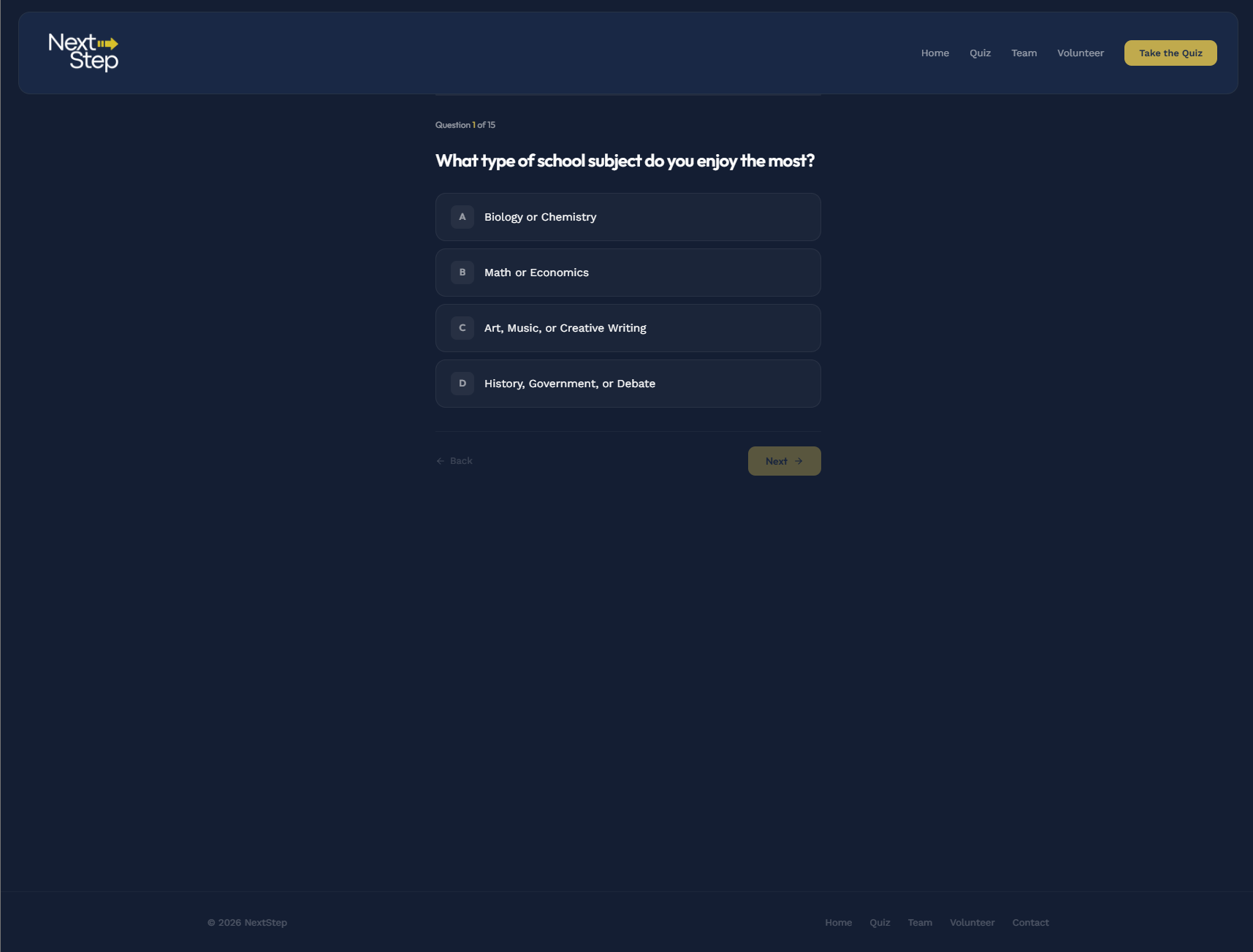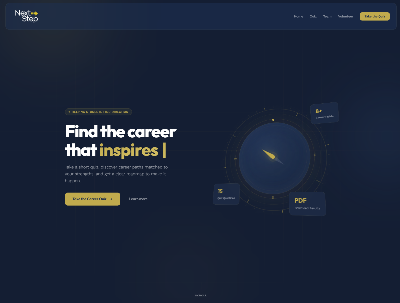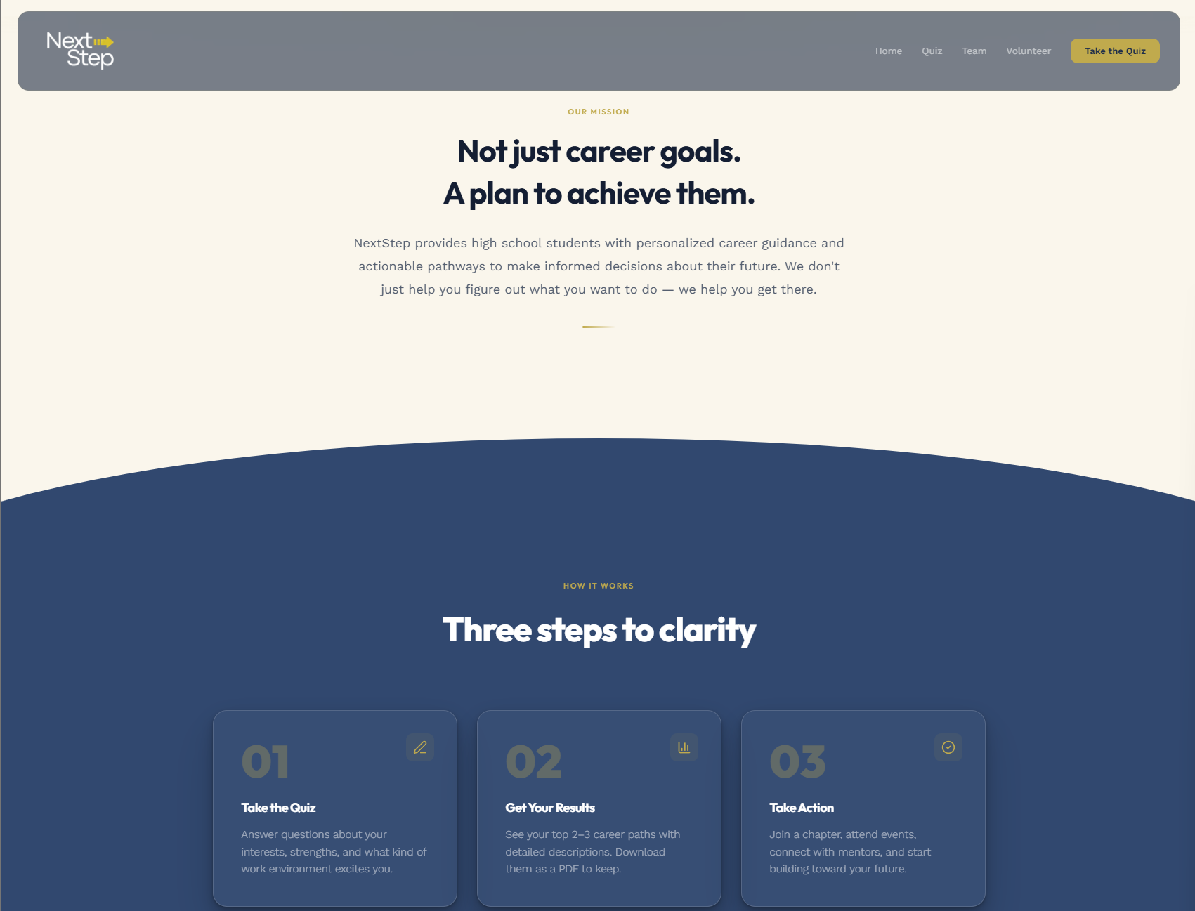 A career guidance platform for high school students. NextStep helps students discover career paths matched to their strengths through a short quiz, then provides actionable roadmaps with mentorship, events, and chapter-based communities to turn goals into plans.