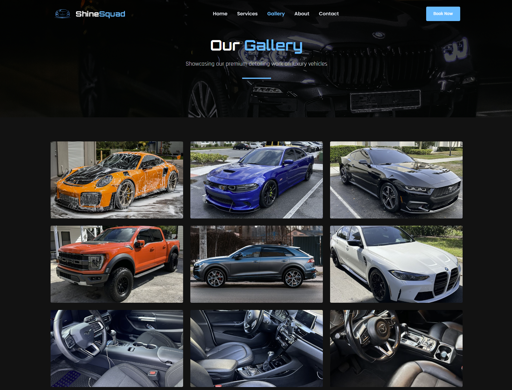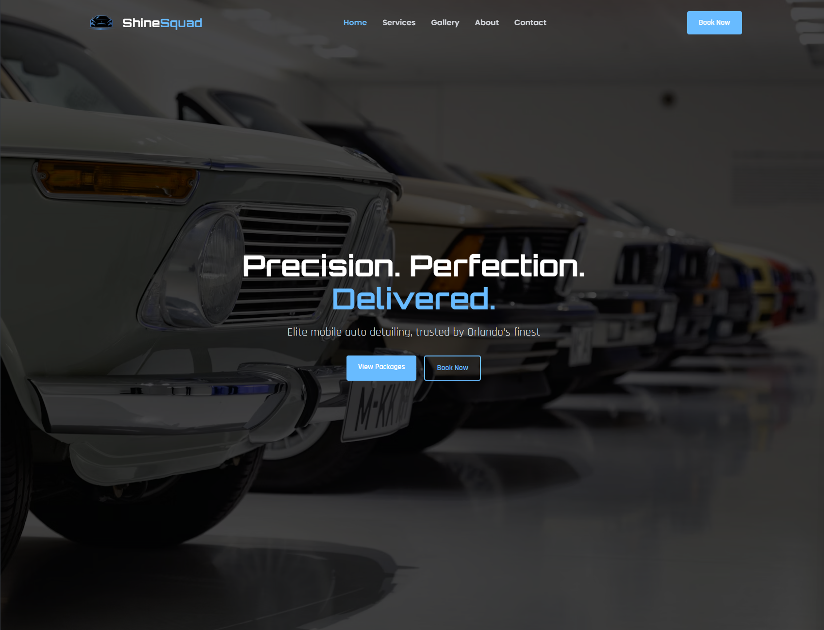 Website for ShineSquad Auto Detailing, a luxury mobile car detailing service based in Orlando. The site showcases premium service packages, features an online booking system, and builds trust through a gallery of detailed vehicles and client testimonials — all designed to convert visitors into booked appointments.