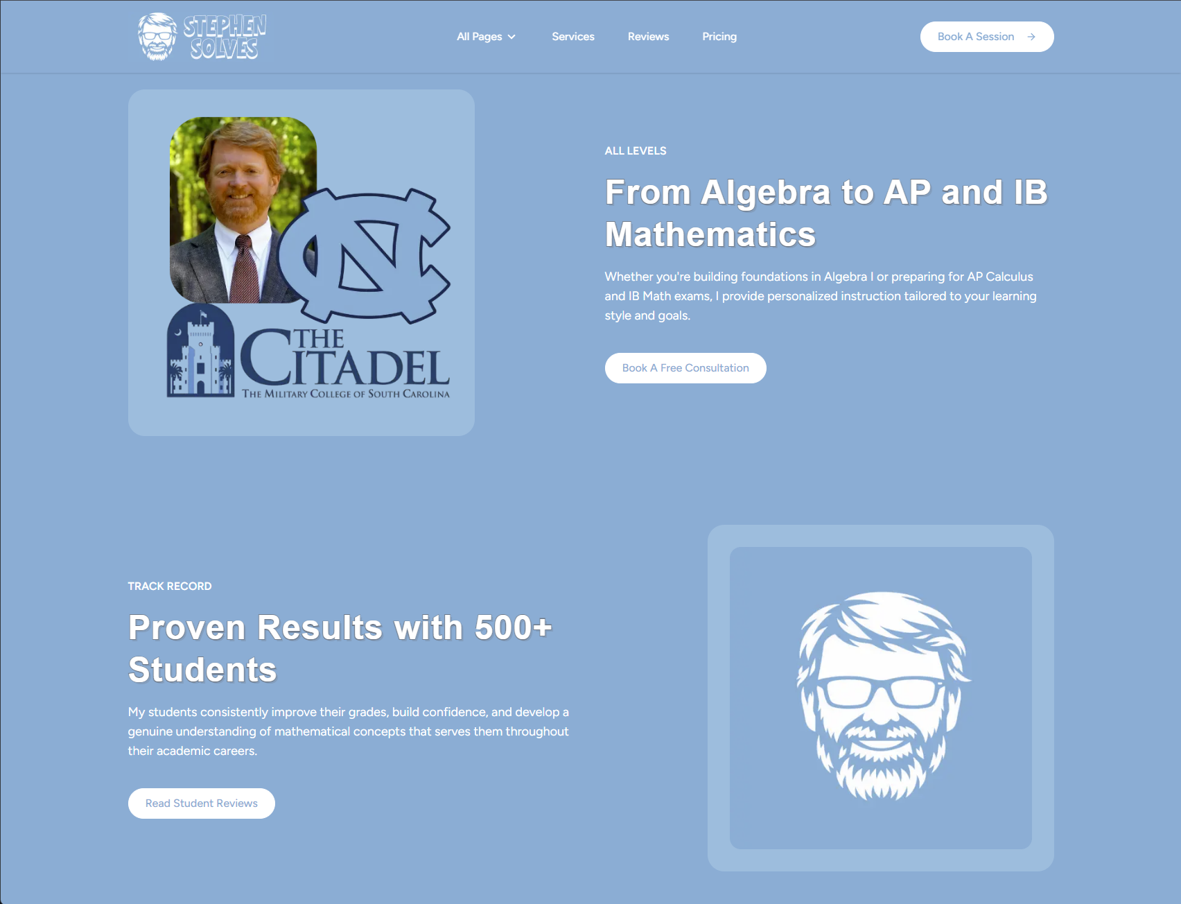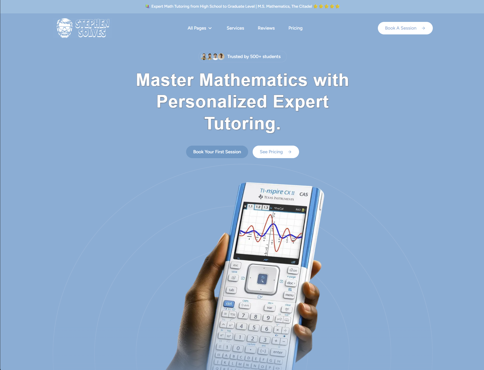 Full-service website for StephenSolves, a personalized math tutoring business covering Algebra through AP Calculus and IB Mathematics. The site showcases subject expertise, student results (500+ tutored, 4.9 rating), transparent pricing, and funnels visitors toward booking a free consultation — with a university acceptance ticker that builds instant credibility.